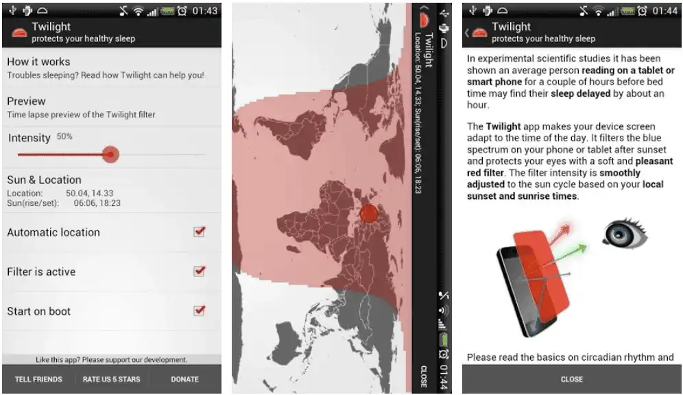 薄暮微光Twilight Pro汉化版,一款护目镜类手机应用,通过软件可以为你的手机屏幕添加类似滤镜的效果,调整手机屏幕的光线,让光线更加柔和,以达到保护眼睛的效果。