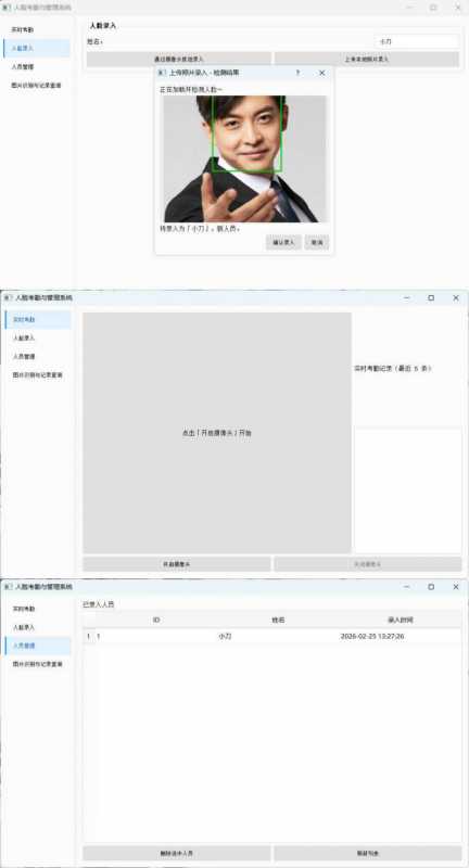 列表展示已录入用户(姓名、录入时间等),支持删除;删除后该人员不再参与识别与考勤。