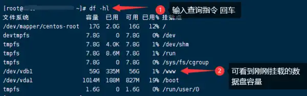 第三步,确认数据盘是否挂载成功,执行以下命令:df -hl 查看/www对应数字是否和数据盘容量一致就OK